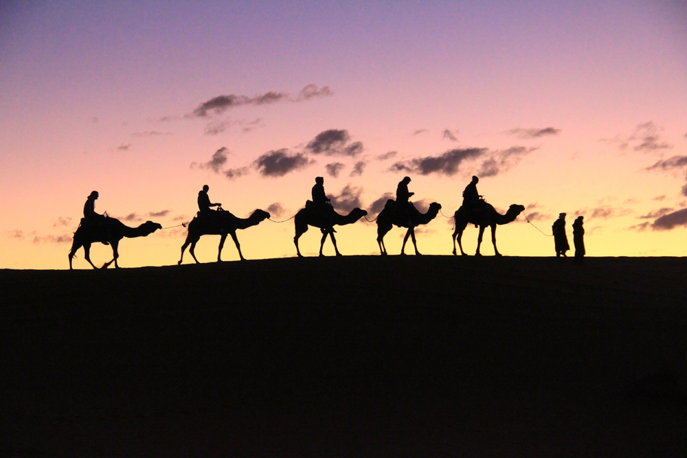 - Start your Saharan journey from Erfoud with a visit to a Nomad village, and lunch a break in a Kasbah hotel by the sand dunes of Erg Chebbi. You will have some time relaxing by the pool before the next part of your adventure. You will walk or ride by camel over the sands as the sun begins to set and as you reach the magnificent Erg Chebbi sand dunes, witness them turning a wonderful red hue. As night falls, listen to the intoxicating beat of Berber drum music and song, enjoying a Moroccan home-cooked feast before sleeping under the stars in your private Berber tent.