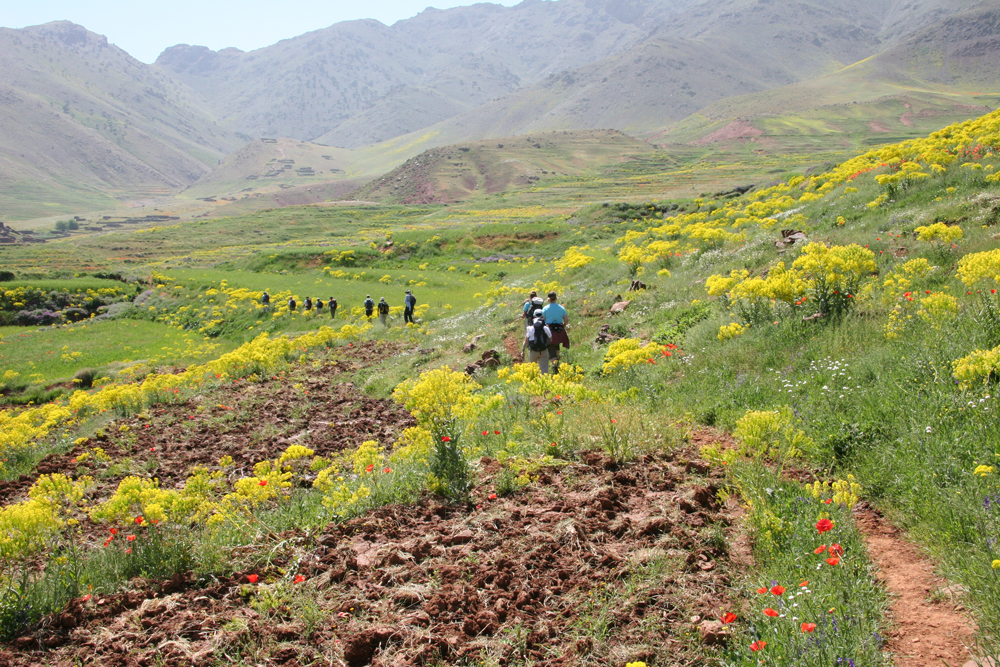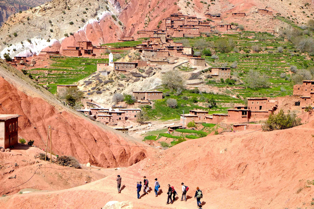 - Today departure from Marrakech south up to Asni weekly market every Saturday then to Imlil (1740m), set in the top level foothills of the High Atlas mountains, a main trailhead with paths branching out in all directions. Upon arrival, we leave the car with a welcome glass of mint tea in the village where you meet a local guide prior to setting out for a walking tour. The tour starts south to the Berber village of Aroumd passing the jagged Western High Atlas peaks of the Toubkal Massif overlooking ancient irrigated terraced fields of barley, corn and vegetables and always surrounded by almond and walnut trees. We thence carry on for another Half an Hour to get to our lunch which will be served among a Berber family in the village of Achayn prior to setting off back down the other side of the valley back to Imlil for the night with dinner in a typical Berber family house.