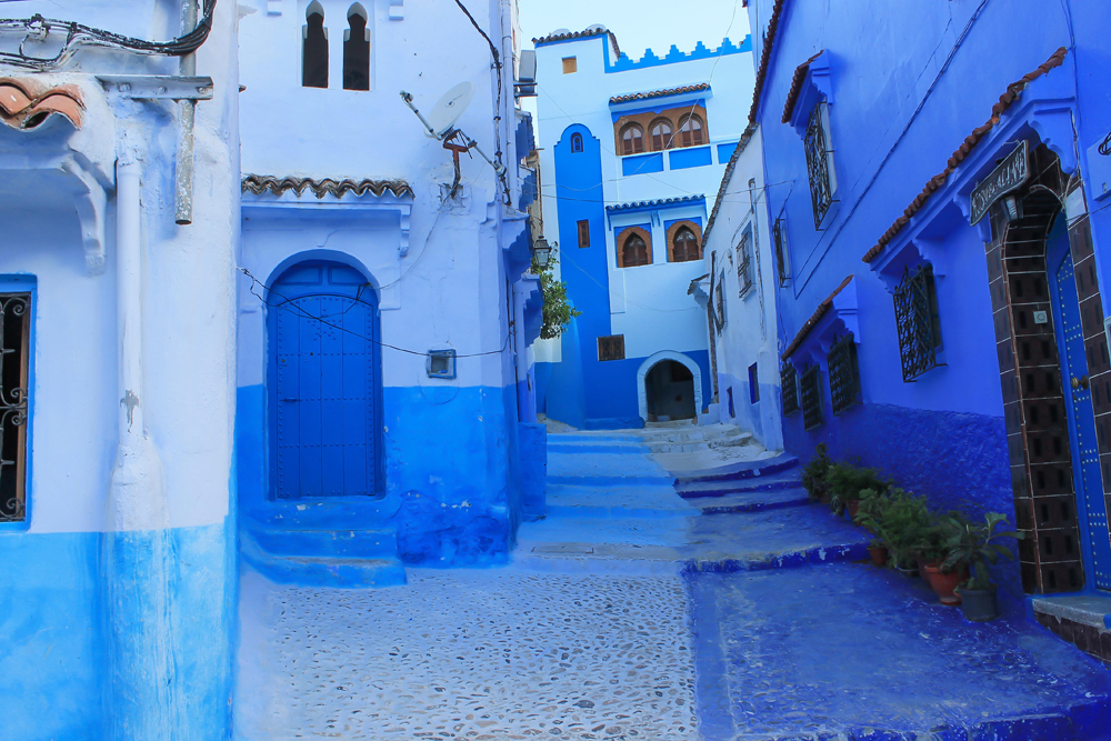 - After breakfast depart from Fes to the charming Chefchaouen. Drive through the breathtaking landscapes of the fertile coastal plains. Continue the road until you arrive in the region of the Rif Mountains which is the heart and location of the quiet blue and white washed city of Chefchaouen. Spend the day wandering the blue washed narrow alleys of the friendly medina. Visit the walled fortress of the Kasbah contains beautiful gardens, near which is the small museum and art gallery which houses the rich culture of the Rif Mountains. From the rooftop of the Kasbah view a spectacular panorama of the blue and white washed houses, tiled roofs and tiny balconies. After exploring the medina, walk in the nearby hillsides with the wonderful and magnificent waterfalls. The town offers many native handicrafts that are not available elsewhere in Morocco, such as wool garments and woven blankets. The goat cheese native to the area is also popular. Dinner and night in a guest House.