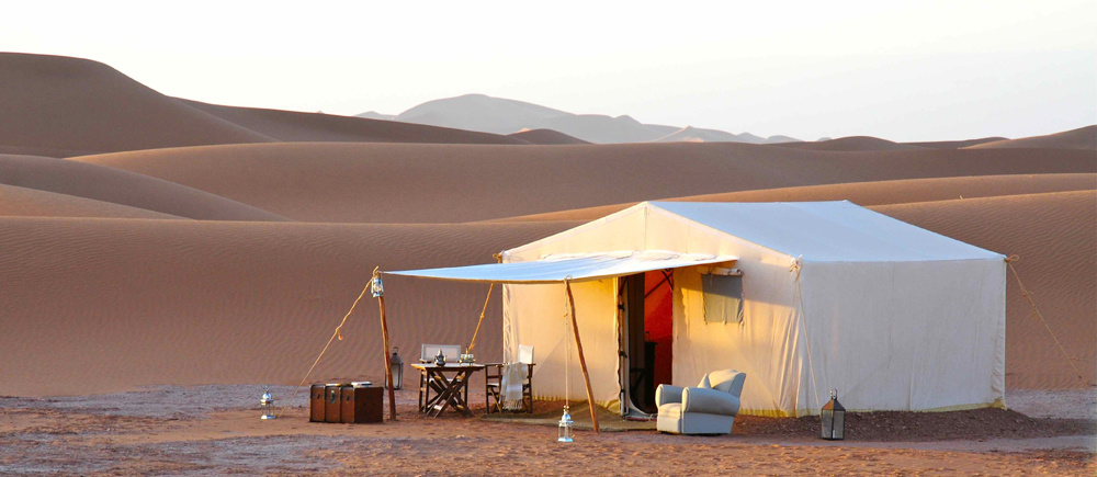 - After breakfast, we start our day with a drive towards the Todra Gorges where many of rock climbers come to enjoy their preferred sport. Later we continue our journey, following the ancient Bedouin trading routes parallel with the Middle Atlas, passing a series of the fortified villages with outstanding pre-Saharian architecture. The route to Erfoud is one of the most pleasing of all the Southern routes. The town is in a dry red built of desert and was built by the French as a central administration town. It is known for its rich black fossils marble. The stone is sculpted to bring the fossils into relief on everything from ashtrays to washbasins and more. We head down to the spectacular Merzouga dunes where sand dunes signify the start of the mighty Sahara Desert. We leave our vehicle and take a camel ride into the luxury desert camp with hot showers and king bed. To seal this as an experience of a life time, why not surf the Sahara Desert and try sand Dunes Boarding! After dinner we gather round the fire and enjoy the desert night perhaps with traditional Berber drums.