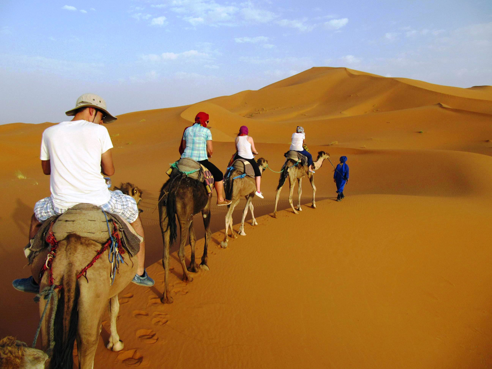- After breakfast, departure from Dades valley towards the Todra Gorges where many rock climbers come to enjoy their preferred sport. Later we continue our journey, following the ancient Bedouin trading routes parallel with the Middle Atlas, passing a series of the fortified villages with outstanding pre-Saharian architecture. The route to Erfoud is one of the most pleasing of all the Southern routes. The town is in a dry red built of desert and was built by the French as a central administration town. It is known for its rich black fossils marble. The stone is sculpted to bring the fossils into relief on everything from ashtrays to washbasins and more. We head down to the spectacular Merzouga dunes where sand dunes signify the start of the mighty Sahara Desert. We leave our vehicle and take a camel ride into the desert to a Berber camp. To seal this as an experience of a life time, why not surf the Sahara Desert and try sand Dunes Boarding! After dinner we gather round the fire and enjoy the desert night perhaps with traditional Berber drums.