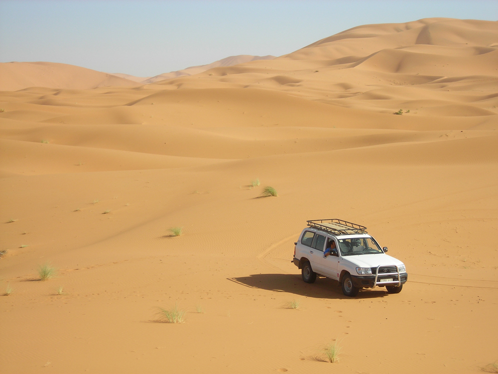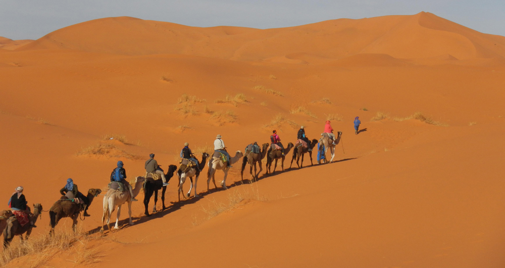 - Start your Saharan journey from Erfoud with a visit to a Nomad village, and lunch a break in a Kasbah hotel by the sand dunes of Erg Chebbi. You will have some time relaxing by the pool before the next part of your adventure. You will walk or ride by camel over the sands as the sun begins to set and as you reach the magnificent Erg Chebbi sand dunes, witness them turning a wonderful red hue. As night falls, listen to the intoxicating beat of Berber drum music and song, enjoying a Moroccan home-cooked feast and spend the overnight in your private tent.